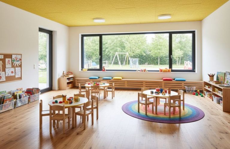 Das sanierte Erdgeschoss der FEG Heidelberg mit neuen Gruppenräumen, Bistro und optimierter Akustik – realisiert mit starken lokalen Handwerksfirmen.