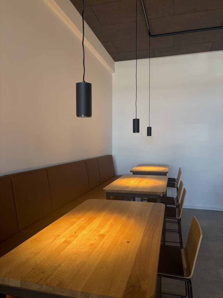 Besondere Highlights der Sanierung: Die Böden bestehen aus hochwertigem Parkett und robustem Vinyl, und die Decke des Bistros wurde gezielt schalltechnisch ertüchtigt. So können Gespräche auch für hörgeschädigte Gäste problemlos geführt werden – eine Maßnahme, die bereits im Vorfeld von uns sorgfältig berechnet und umgesetzt wurde.